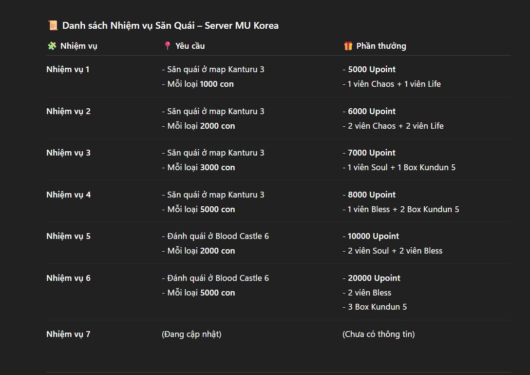 - Nhiệm vụ sẽ được làm mới vào lúc 00h hàng ngày